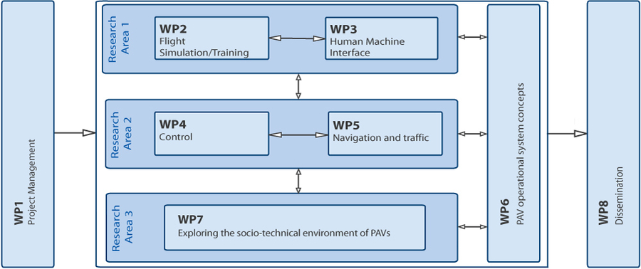 The project work has been divided into workpackages (WP). WP1 includes the management activities. Research & technology development activities are covered by WP2, WP3, WP4, WP5 and WP7, and run in parallel in three separate research areas; Training and perceptually based HMI, Automation, and Socio-economical Assessment. All research areas provide information for WP6 as an integration of all research areas into an existing aerial vehicle. Finally, the dissemination and exploitation is included in WP8.